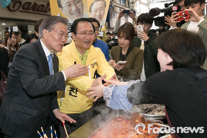 (창원=포커스뉴스) 문재인(왼쪽) 전 더불어민주당 대표가 5일 오후 경남 창원시 성산구 반송시장에서 노회찬(왼쪽 두번째) 정의당 창원성산 후보 지원유세 중, 상인과 악수하고 있다. 노 후보는 창원성산에서 허성무 더불어민주당 후보와 경합에서 승리해, 더민주 · 정의당 단일후보로 출마한다.