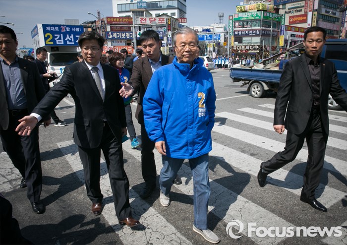 (평택=포커스뉴스) 5일 오후 경기도 평택역 앞 광장에서 더불어민주당 평택지역 합동유세를 마친 김종인 비대위 대표 겸 선대위원장이 다음 일정으로 이동하고 있다.