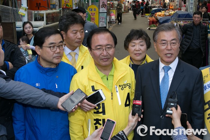 (창원=포커스뉴스) 문재인(오른쪽) 전 더불어민주당 대표가 5일 오후 경남 창원시 성산구 반송시장에서 노회찬(가운데) 정의당 창원성산 후보 지원유세를 마친 뒤, 인터뷰를 하고 있다. 노 후보는 창원성산에서 허성무(왼쪽) 더불어민주당 후보와 경합에서 승리해, 더민주 · 정의당 단일후보로 출마한다.