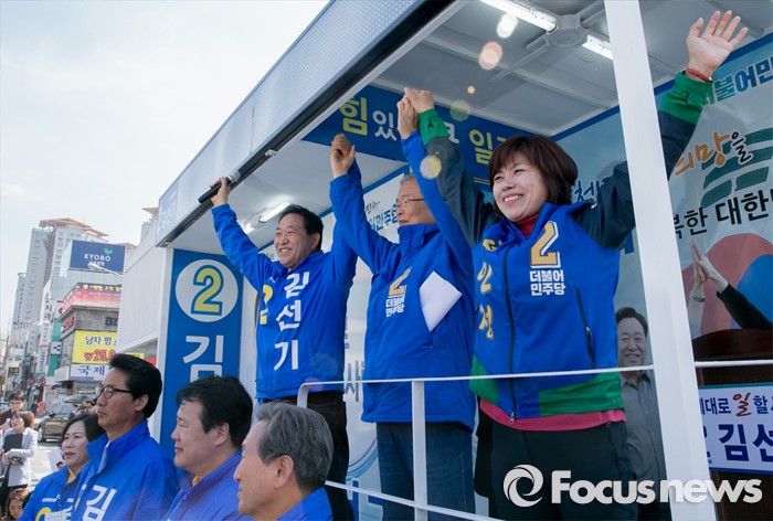 (평택=포커스뉴스) 5일 오후 경기도 평택역 앞 광장에서 열린 더불어민주당 평택지역 합동유세에 참석한 김종인(가운데) 비대위 대표 겸 선대위원장이 고인정(오른쪽) 평택갑, 김선기 평택을 후보와 손을 들어 포즈를 취하고 있다.