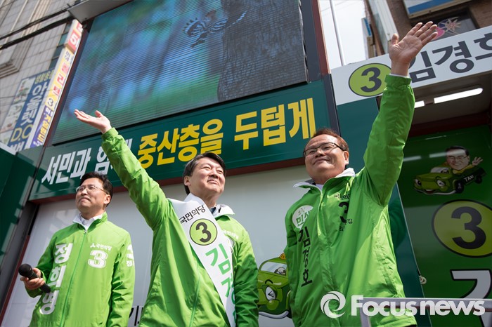 (의정부=포커스뉴스) 안철수 국민의당 상임공동대표(가운데)가 5일 오후 의정부시 태평로 제일시장 앞에서 김경호 의정부갑 후보(오른쪽) 지원유세를 하고 있다.