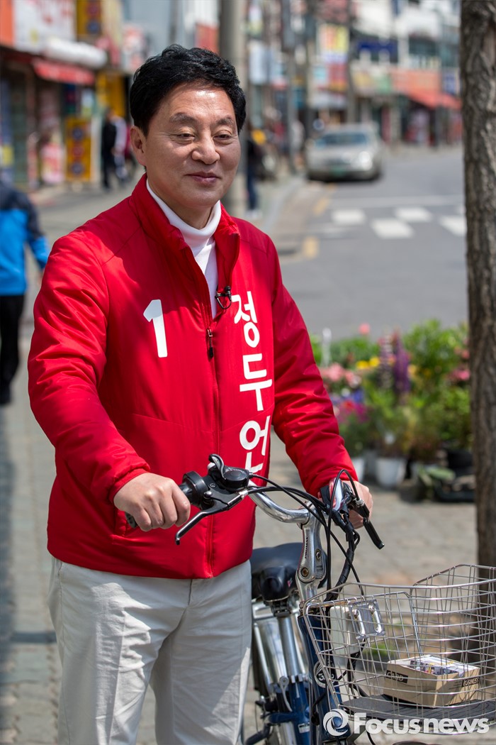 (서울=포커스뉴스) 정두언 새누리당 서대문을 후보가 5일 오후 서울 서대문구 백련시장 일대에서 자전거를 타고 주민들을 만나며 한 표를 호소 하고 있다.