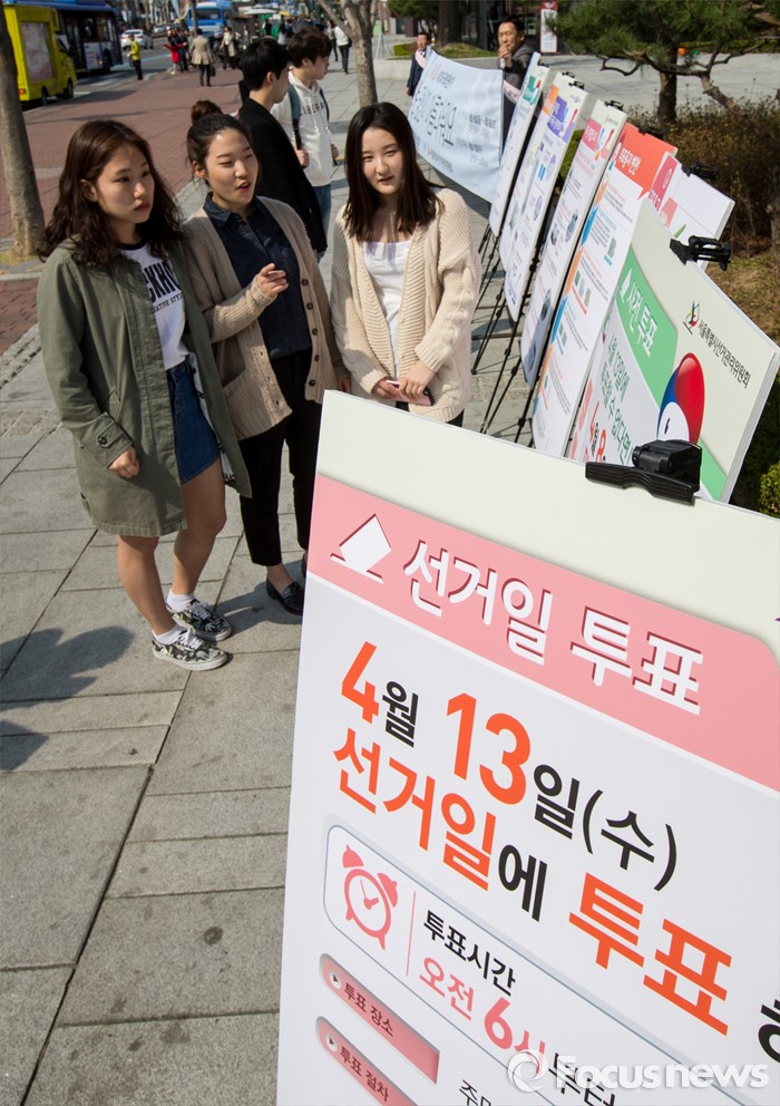 (서울=포커스뉴스) 20대 국회의원선거를 8일 앞둔 5일 오후 서울 종로구 마로니에공원 인근에 설치된 4.13총선 투표참여 홍보자료를 청년 유권자들이 유심히 살펴보고 있다.