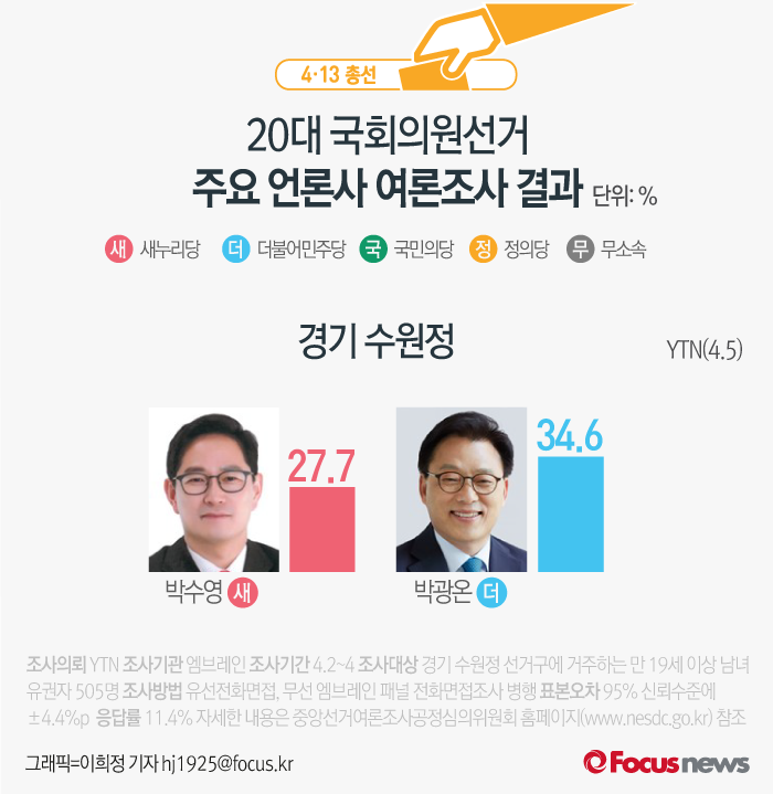 (서울=포커스뉴스) YTN이 엠브레인에 의뢰해 5일 발표한 여론조사 결과에 따르면 새누리당 박수영 후보의 지지율은 27.7%, 더불어민주당 박광온 후보는 34.6%를 기록했다.