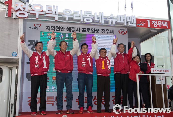 (청주=포커스뉴스) 김무성 새누리당 대표가 5일 오후 충북 청주 성안길에서 정우택, 최현호, 오성균 후보의 지지를 호소하고 있다.