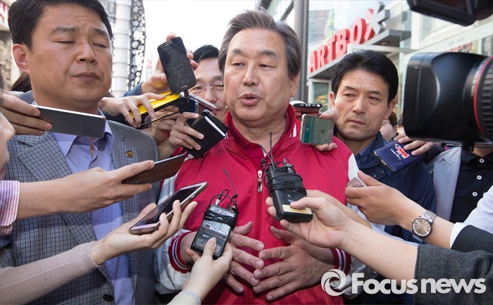 (청주=포커스뉴스) 김무성 새누리당 대표가 5일 오후 충북 청주 성안길에서 지원유세를 마치고 취재진 질문에 답변하고 있다.