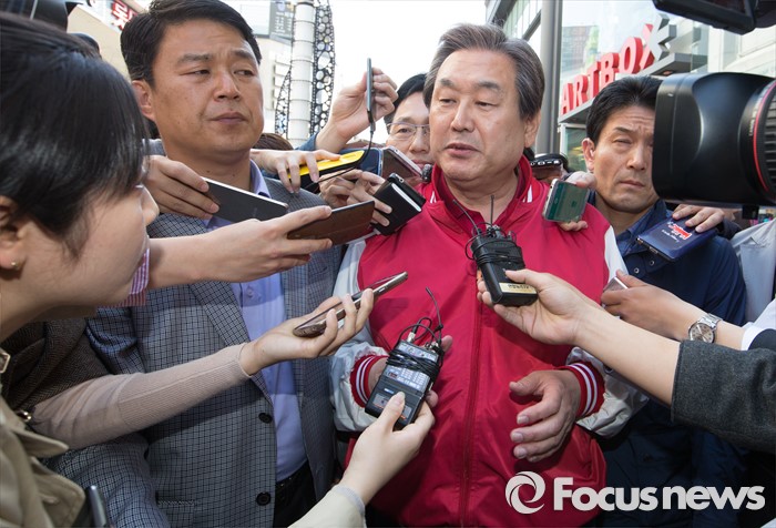 (청주=포커스뉴스) 김무성 새누리당 대표가 5일 오후 충북 청주 성안길에서 지원유세를 마치고 취재진 질문에 답변하고 있다.