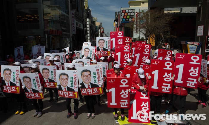 (청주=포커스뉴스) 5일 오후 충북 청주 성안길에서 새누리당 선거운동원들이 지지를 호소하고 있다.