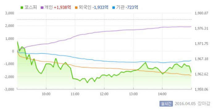 5일 코스피지수는 전일 대비 0.82%(16.23포인트) 하락한 1962.74에 장을 마쳤다. 코스닥지수는 전날 보다 0.18%(1.28포인트) 내린 695.70에 마감했다.