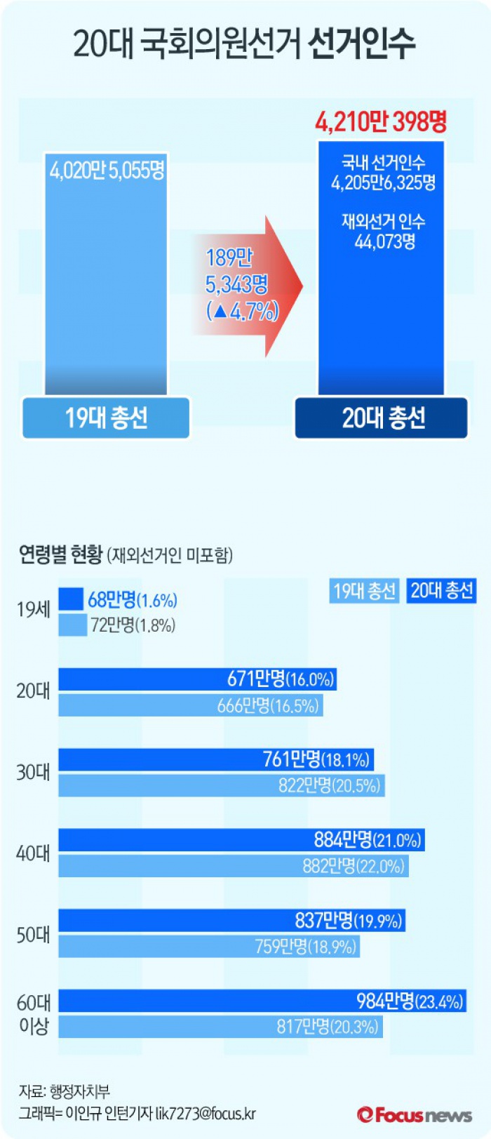 (서울=포커스뉴스)행정자치부는 3일 이번 제20대 국회의원선거의 선거인수가 선거인명부 확정일(4.1.일) 기준으로 총 4,210만 398명 이라고 밝혔다.