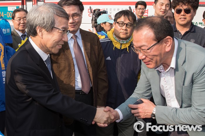 (서울=포커스뉴스) 5일 오후 서울 수서역 인근에서 20대 총선에 출마한 전현희 더불어민주당 강남을 후보의 고문으로 활동하기로 한 정운찬 전 국무총리가 유권자들에게 지지를 호소하고 있다.