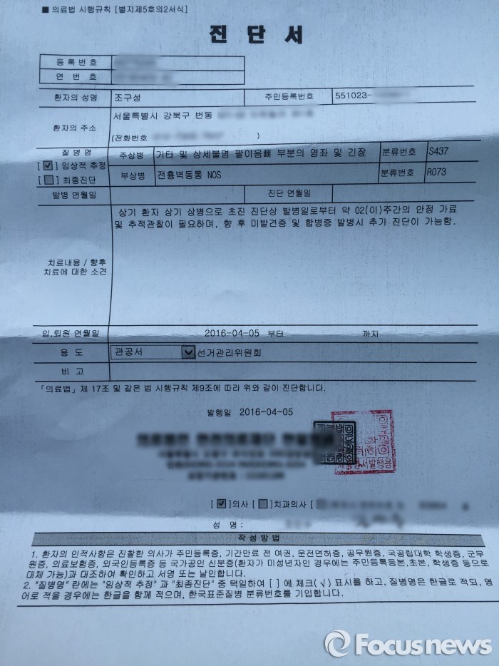사건을 수사 중인 강북경찰서 지능수사팀 관계자는 "아직 수사 중이라 정확한 내용을 밝힐 수 없다"고 전했다.조구성 국민의당 강북을 후보가 5일 더불어민주당 관계자에게 폭행을 당했다고 주장하고 있다. 조 후보가 5일 받은 전치 2주 진단서. 김대석 기자