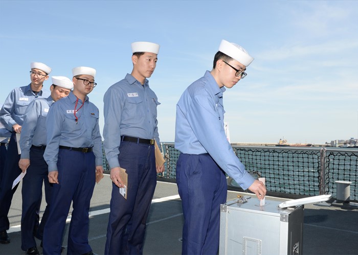 (서울=포커스뉴스) 해군 1함대 광개토대왕함 장병들이 5일 오후 KD-I 광개토대왕함 함미갑판에서 거소투표를 하고 있다. <사진제공=해군>