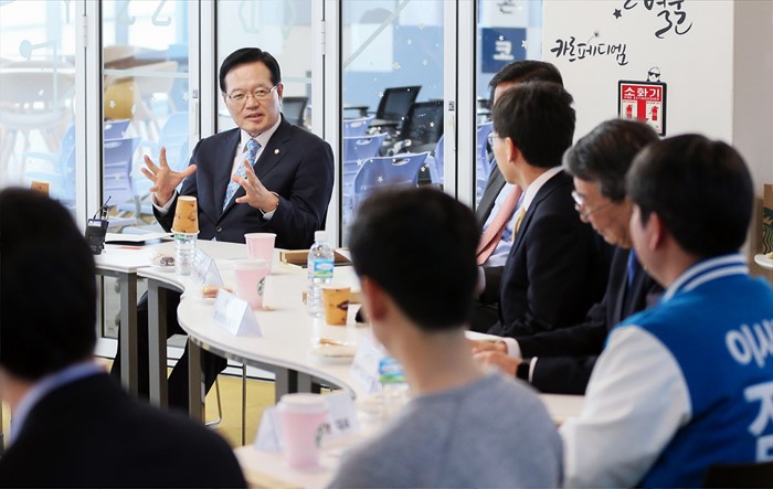 (서울=포커스뉴스) 정의화 국회의장이 5일 오전 성남 분당구 경기창조경제혁신센터를 방문해 ICT(Information & Communication Technology) 관련 산업 관계자들과 간담회를 갖고 애로사항을 청취하고 있다. <사진제공=국회>