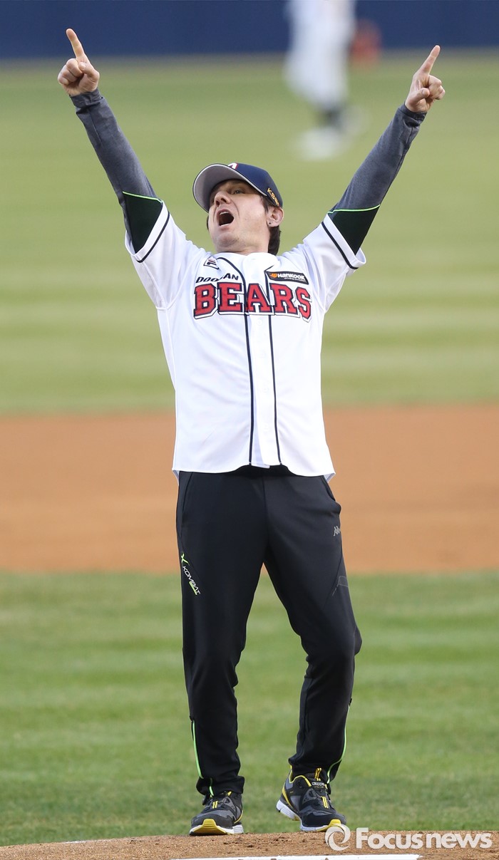(서울=포커스뉴스) 5일 서울 잠실구장에서 열린 2016프로야구 NC-두산 잠실 개막 경기에서 'She's gone.'을 부른 가수 밀젠코 마티예비치가 시구전에 팬들을 향해 승리의 포효를 하고 있다.