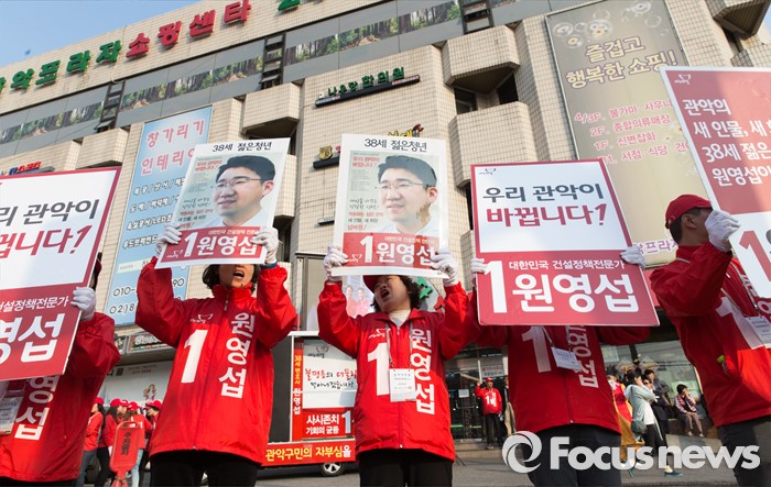 (서울=포커스뉴스) 5일 오후 서울 관악프라자센터 앞에서 원영섭 새누리당 관악구갑 후보가 선거유세를 하고 있다.