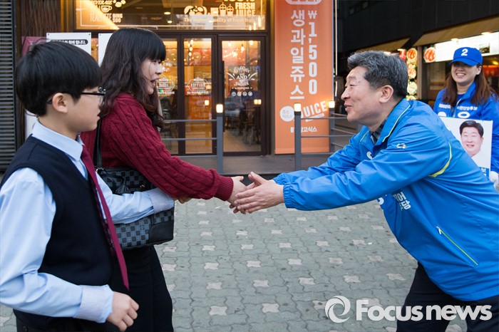 (인천=포커스뉴스) 20대 총선에 출마한 더불어민주당 윤종기 연수을 후보가 5일 오후 인천 연수구 송도동 일대에서 유권자에게 지지를 호소하고 있다.