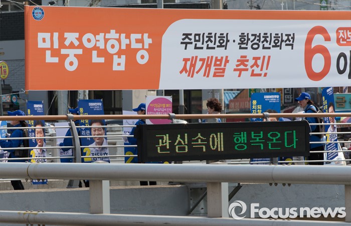 (서울=포커스뉴스) 5일 오후 서울 관악구 삼성동시장 앞에서 정태호 더불어민주당 관악구을 후보 선거운동원들이 지원유세를 하고 있다.