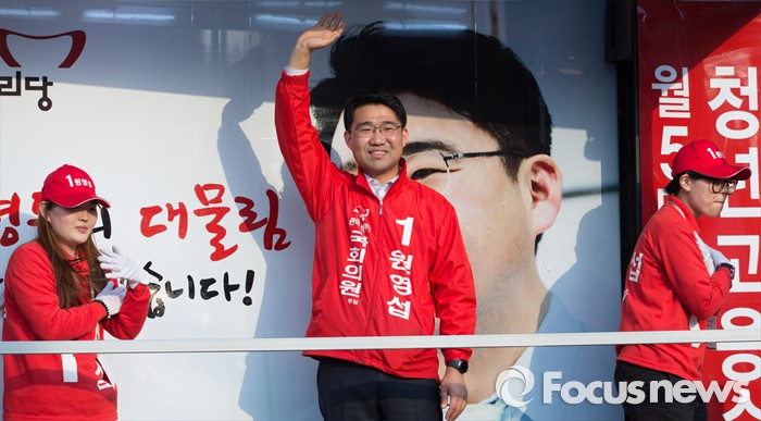 (서울=포커스뉴스) 5일 오후 서울 관악프라자센터 앞에서 원영섭 새누리당 관악구갑 후보가 선거유세를 하고 있다.