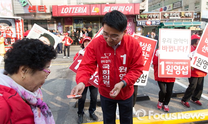 (서울=포커스뉴스) 5일 오후 서울 관악프라자센터 앞에서 원영섭 새누리당 관악구갑 후보가 선거유세를 하고 있다.