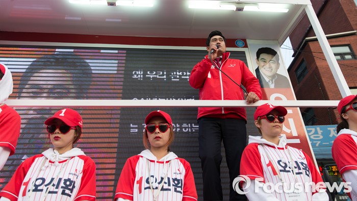 (서울=포커스뉴스) 5일 오후 서울 관악구 김한의원 앞에서 오신환 새누리당 관악구을 후보가 선거유세를 하고 있다.