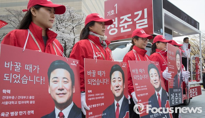 (서울=포커스뉴스) 20대 총선에 출마한 정준길 새누리당 광진을 후보가 5일 오후 서울 건대입구역 인근에서 유권자들에게 지지를 호소하고 있다.