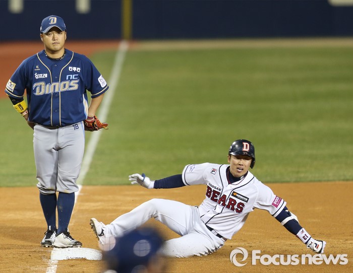 (서울=포커스뉴스) 5일 서울 잠실구장에서 열린 2016프로야구 NC-두산 경기 2회말 2사 만루에서 두산 허경민이 중견수를 넘기는 주자일소 3루타를 치고 3루에서 슬라이딩하고 있다.