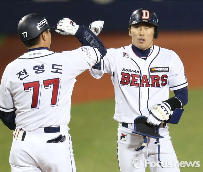 (서울=포커스뉴스) 5일 서울 잠실구장에서 열린 2016프로야구 NC-두산 경기 2회말 2사 만루에서 두산 허경민이 중견수를 넘기는 주자일소 3루타를 치고 전형도 3루 코치의 환영을 받고 있다.