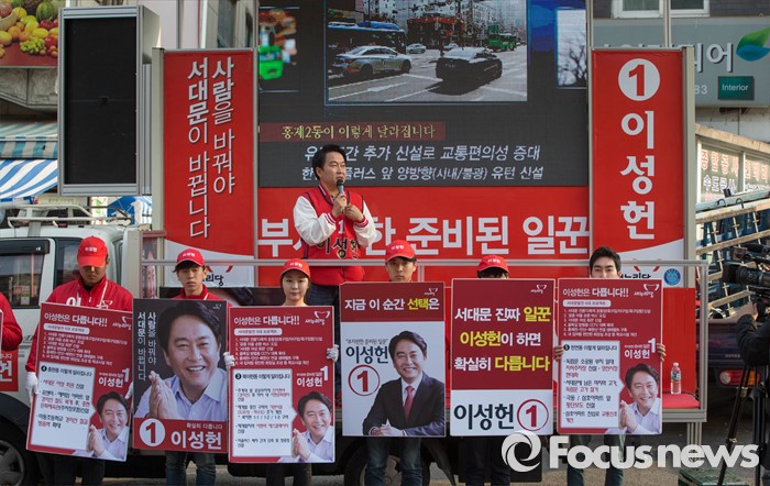 (서울=포커스뉴스) 5일 오후 서울 서대문구 충현동 인근에서 새누리당 서대문갑 이성헌 후보가 유세를 하고 있다.