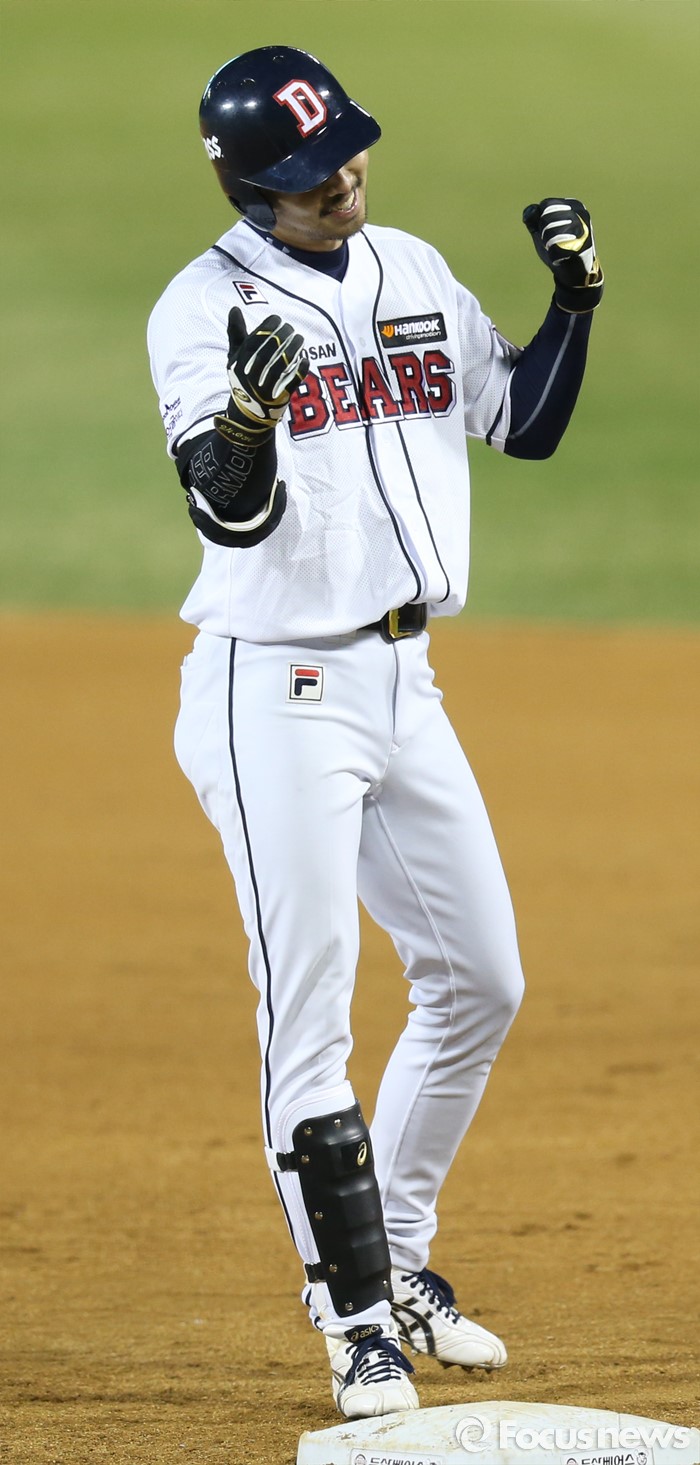 (서울=포커스뉴스) 5일 서울 잠실구장에서 열린 2016프로야구 NC-두산 경기 3히말 1사 1루에서 두산 오재원이 우익수앞 안타를 치고 1루에서 기뻐하고 있다.C