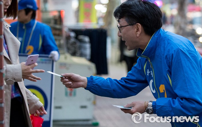 (서울=포커스뉴스) 5일 오후 서울 중구 신당역 인근에서 선거유세에 나선 이지수 더불어민주당 중구성동구을 후보가 퇴근길의 유권자에게 지지를 호소하고 있다.