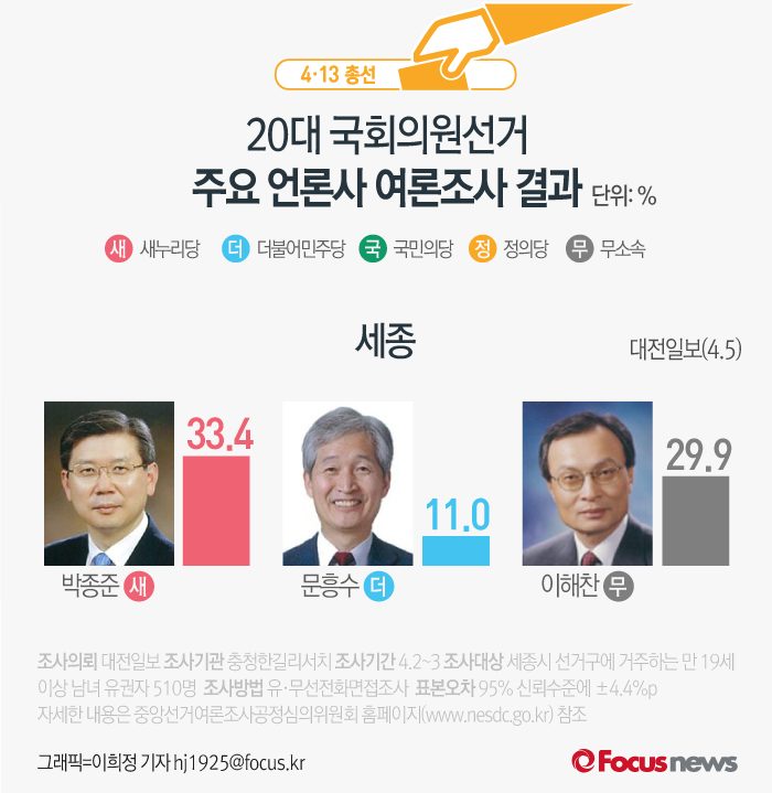 이번에 보실 지역구는 세종 선거구입니다.(서울=포커스뉴스) 한국일보가 코리아리서치에 의뢰해 30일 발표한 여론조사 결과에 따르면 새누리당 박종준 후보는 지지율 35.4%를 기록, 무소속 이해찬 후보(26.9%)를 근소한 차이로 따돌렸다. 2016.03.30 이인규 인턴기자