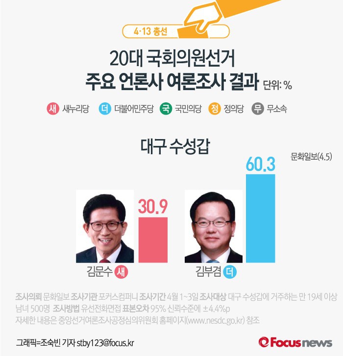 국민일보·CBS 여론조사는 1~3일 대구 수성갑 선거구에 거주하는 만 19세 이상 남녀 500명을 대상 유선ARS와 모바일 조사 방식으로 진행됐다.표본오차는 95% 신뢰수준에 ±4.4%p다. 자세한 내용은 중앙선거여론조사공정심의위원회 홈페이지(www.nesdc.go.kr)에서 찾아볼 수 있다.(서울=포커스뉴스) 문화일보가 여론조사기관 포커스컴퍼니에 의뢰해 5일 발표한 결과에 따르면 더민주 김부겸 후보가 60.3%, 새누리당 김문수 후보가 30.9%의 지지율을 보이는 것으로 조사됐다. 2016.04.05 조숙빈 기자 (서울=포커스뉴스) SBS가 TNS에 의뢰해 29일 발표한 여론조사 결과에 따르면 더민주 김부겸 후보가 52.9%의 지지율로 새누리당 김문수 후보(34.6%)보다 더 높은 지지를 받는것으로 나타났다. 2016.03.30 조숙빈 기자