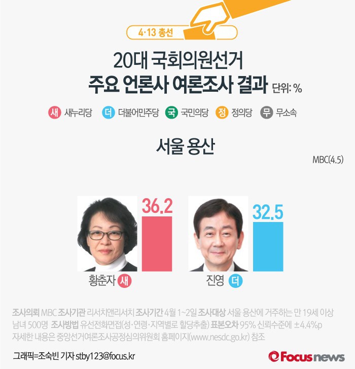(서울=포커스뉴스) MBC가 여론조사기관 리서치앤리서치에 의뢰해 5일 발표한 결과에 따르면 서울 용산에서 새누리당 황춘자 후보의 지지율은 36.2%, 더민주 진영 후보의 지지율은 32.5%인 것으로 나타났다.
