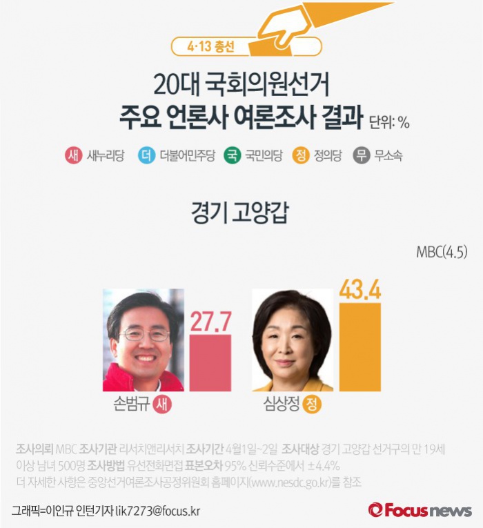 (서울=포커스뉴스) MBC가 여론조사기관 리서치앤리서치에 의뢰해 5일 발표한 결과에 따르면 경기 고양갑에서 새누리당 손범규 후보의 지지율은 27.7%, 정의당 심상정 후보의 지지율은 43.4%인 것으로 나타났다.