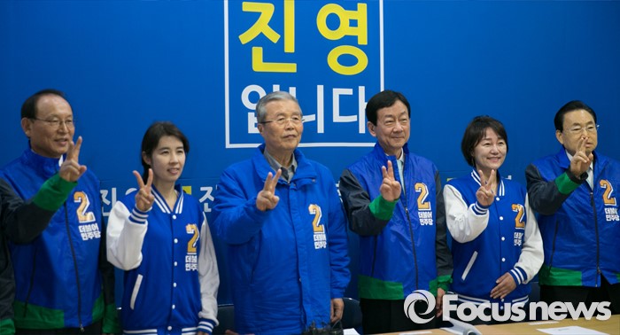 (서울=포커스뉴스) 6일 오전 진영 더불어민주당 서울 용산구 후보 선거사무소에서 열린 중앙선거대책위원회의에 참석한 김종인 비대위 대표 겸 선대위원장 등 참석자들이 취재진을 향해 포즈를 취하고 있다. 왼쪽부터 최운열, 박경미 비례대표 후보, 김 대표, 진 후보, 이재정 비례대표 후보, 송현섭 부위원장.