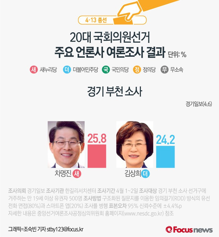(서울=포커스뉴스) 경기일보가 여론조사기관인 한길리서치센터에 의뢰해 6일 발표한 결과에 따르면 경기 부천 소사에서 새누리당 차명진 후보의 지지율은 25.8%, 더불어민주당 김상희 후보의 지지율은 24.2%로 오차범위내 혼전 양상을 보이고 있다.