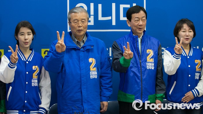 (서울=포커스뉴스) 6일 오전 진영 더불어민주당 서울 용산구 후보 선거사무소에서 열린 중앙선거대책위원회의에 참석한 김종인 비대위 대표 겸 선대위원장과 후보들이 포즈를 취하고 있다. 왼쪽부터 박경미 비례대표 후보, 김 대표, 진 후보, 이재정 비례대표 후보.