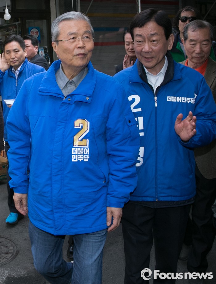 (서울=포커스뉴스) 김종인(왼쪽) 더불어민주당 비대위 대표 겸 선대위원장과 진영 서울 용산구 후보가 6일 오전 용문시장을 방문해 대화를 하며 이동하고 있다.