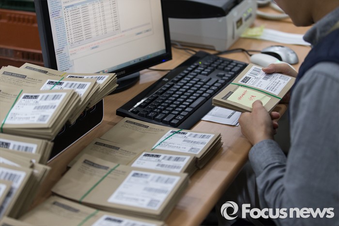 (인천=포커스뉴스) 제20대 국회의원선거 재외투표 우편물 접수 시작일인 6일 오전 인천 중구 국제우편물류센터에서 한 직원이 재외투표 회송 우편물을 접수하고 있다.
