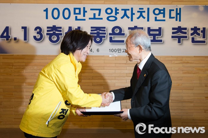 (고양=포커스뉴스) 20대 총선을 일주일 앞둔 6일 오전 고양시 일산동구의 한 교회에서 열린 '100만고양자치연대' 좋은후보 추천식에 참석한 심상정 정의당 고양시갑 후보가 추천서를 받고 있다.