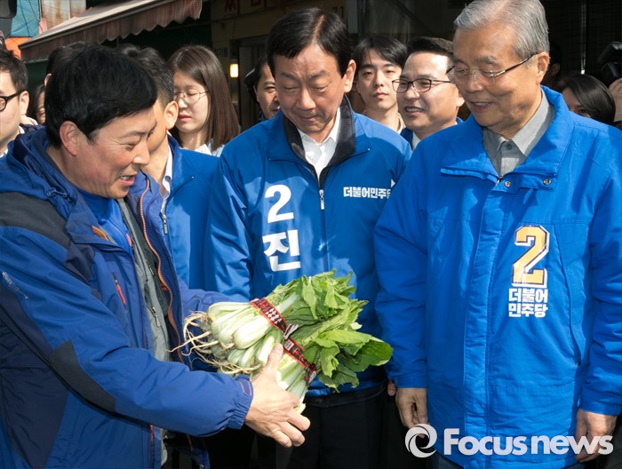 (서울=포커스뉴스) 김종인(오른쪽) 더불어민주당 비대위 대표 겸 선대위원장과 진영(가운데) 서울 용산구 후보가 6일 오전 용문시장을 방문해 상인의 채소를 보며 대화하고 있다.