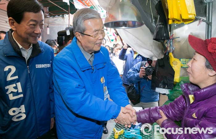 (서울=포커스뉴스) 김종인(가운데) 더불어민주당 비대위 대표 겸 선대위원장과 진영(왼쪽) 서울 용산구 후보가 6일 오전 용문시장을 방문해 상인들과 인사하며 지지를 호소하고 있다.
