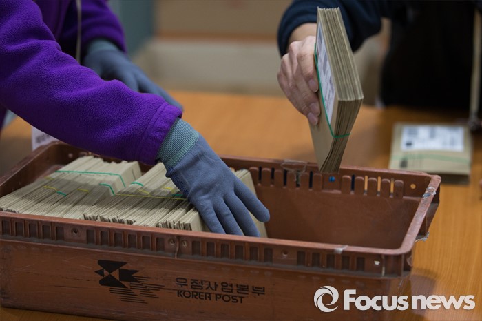 (인천=포커스뉴스) 제20대 국회의원선거 재외투표 우편물 접수 시작일인 6일 오전 인천 중구 국제우편물류센터에서 직원들이 재외투표 회송 우편물을 분류하고 있다.