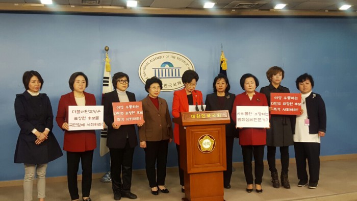 새누리당 중앙여성위원회 소속 황인자 의원은 이날 오전 국회 기자회견에서 중여위 일동의 명의로 된 회견문을 낭독하며 "더민주가 책임있는 정당이라면 표 후보의 망언에 대해 국민께 사죄하고 당 차원의 조치를 당장 시행해야 마땅하다"고 말했다.