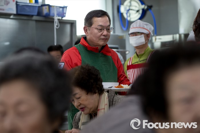 (서울=포커스뉴스) 안대희 새누리당 마포구갑 후보가 6일 오전 서울 마포구 용강노인복지회관에서 배식봉사를 하고 있다.