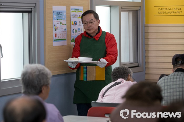 (서울=포커스뉴스) 안대희 새누리당 마포구갑 후보가 6일 오전 서울 마포구 용강노인복지회관에서 배식봉사를 하고 있다.