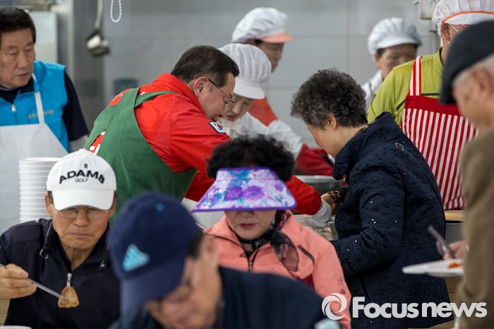 (서울=포커스뉴스) 안대희 새누리당 마포구갑 후보가 6일 오전 서울 마포구 용강노인복지회관에서 배식봉사를 하고 있다.