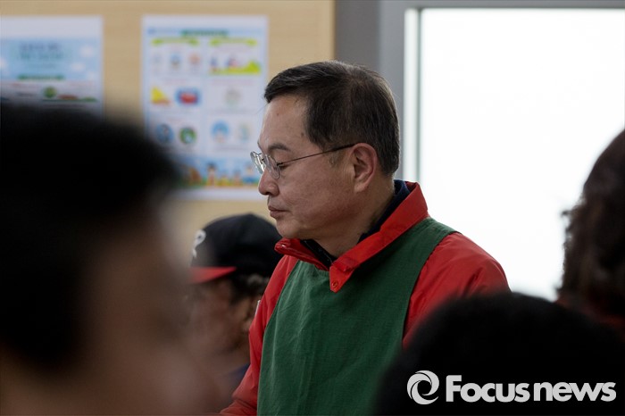 (서울=포커스뉴스) 안대희 새누리당 마포구갑 후보가 6일 오전 서울 마포구 용강노인복지회관에서 배식봉사를 하고 있다.