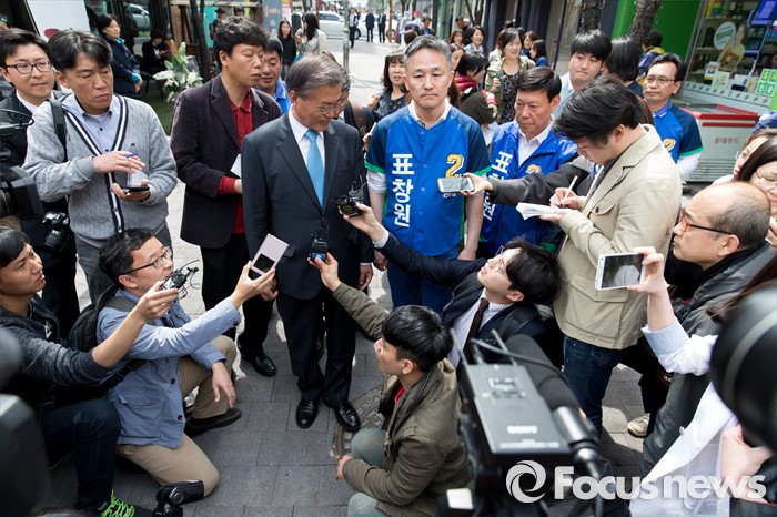 (용인=포커스뉴스) 6일 오전 경기 용인 기흥구 보정동 카페거리에서 문재인 더불어민주당 전 대표가 표창원 더민주 용인시정 후보 지원유세 중 취재진 질문에 답하고 있다.
